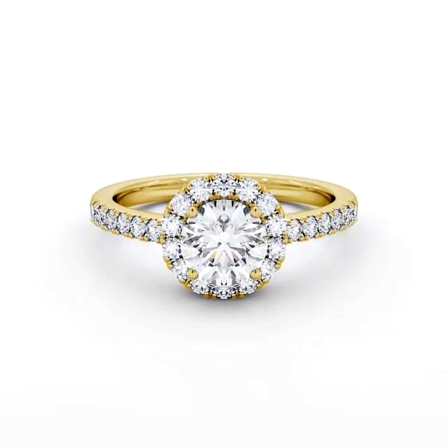 Nola diamond engagement ring with a halo 9K Yellow Gold setting. Shimmering amid the diamond-studded shoulder and frame, a large round diamond radiates remarkable shine at the centre. Band width is 1.7mm. Smaller diamonds will be of VS1 Clarity and F Colour as standard. This ring is available in a range of metal options and your choice of natural or lab grown diamonds. We offer a free design service for any customised changes that you may require.