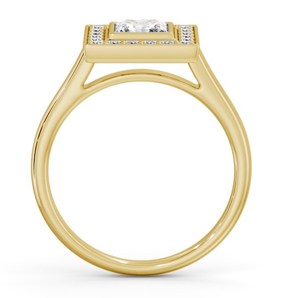 Roma diamond engagement ring with a halo 9K Yellow Gold setting. With grace and allure, this engagement ring showcases a centre round diamond wrapped in a frame of smaller diamonds, and additional diamonds on crossover split shank. Smaller diamonds will be of standard quality VS1 Clarity and F Colour. This ring is available in a range of metal options and your choice of natural or lab grown diamonds. We offer a free design service for any customised changes that you may require.