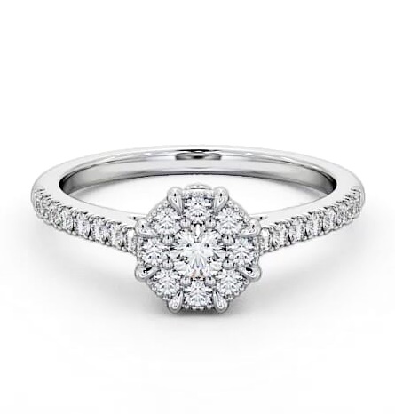 Denver diamond engagement ring with a halo Platinum setting. Vintage and eye-catching, this ring features a centre round diamond and a halo of small round diamonds raised over an artistic undercarriage. The cross over style shoulders glitter with additional diamonds. Smaller diamonds will be of VS1 Clarity and F Colour as standard. This ring is available in a range of metal options and your choice of natural or lab grown diamonds. We offer a free design service for any customised changes that you may require.