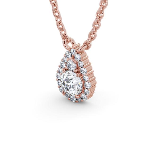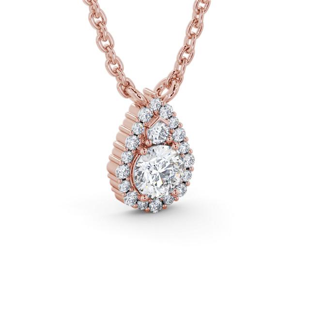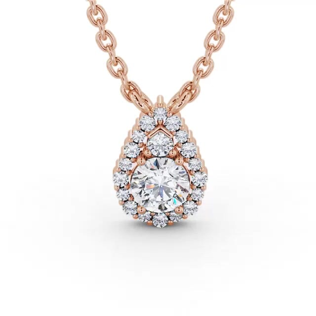 Adaline halo diamond pendant in 18K Rose Gold. Meticulously arranged in a pear-shaped frame, this pendant features a large round diamond topped and haloed by smaller round diamonds. Smaller round cluster diamonds will be of standard quality VS1 Clarity and F Colour. This pendant is available in a range of metal and chain options with your choice of natural or lab grown diamonds. We offer a free design service for any customised changes that you may require.