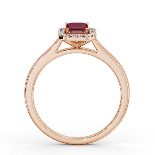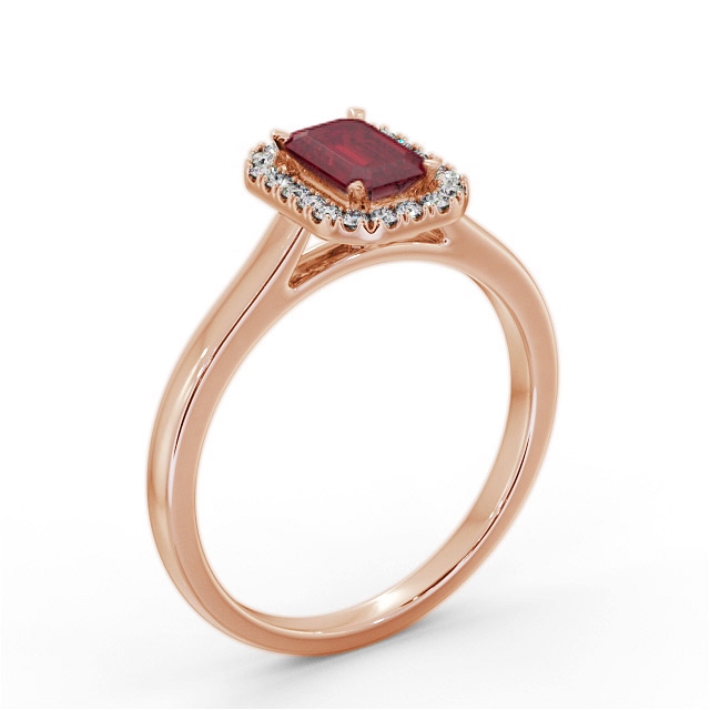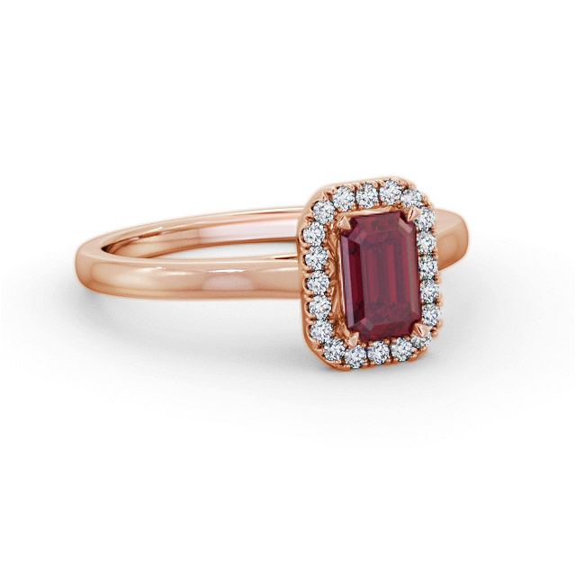 Gianni halo ruby and diamond 0.90ct ring in 18K Rose Gold. A single 0.75ct Emerald shaped ruby is surrounded by a cluster of small round shaped diamonds totaling 0.15ct in this traditional and impressive design ring. This ring is available in a variety of metal types and your choice of natural or lab grown gems. We provide a free design service for any special modifications that you may require.