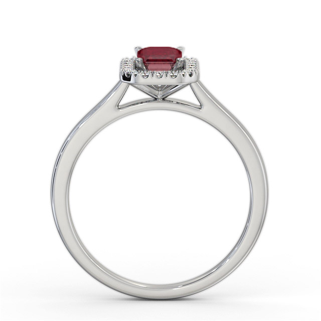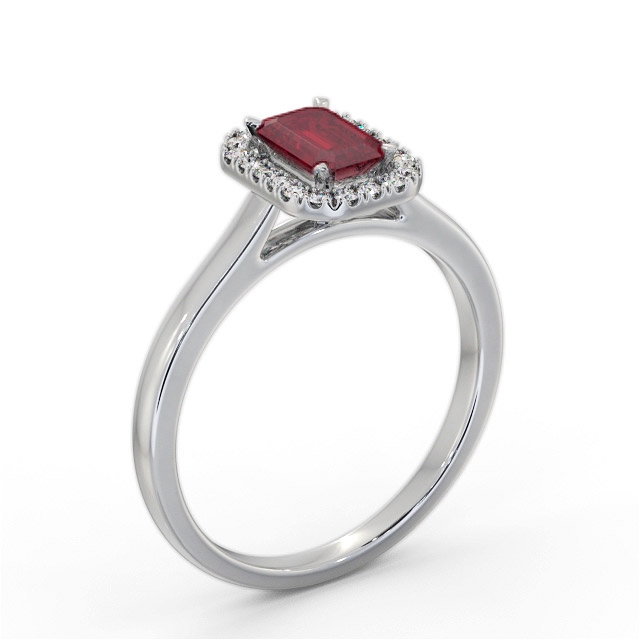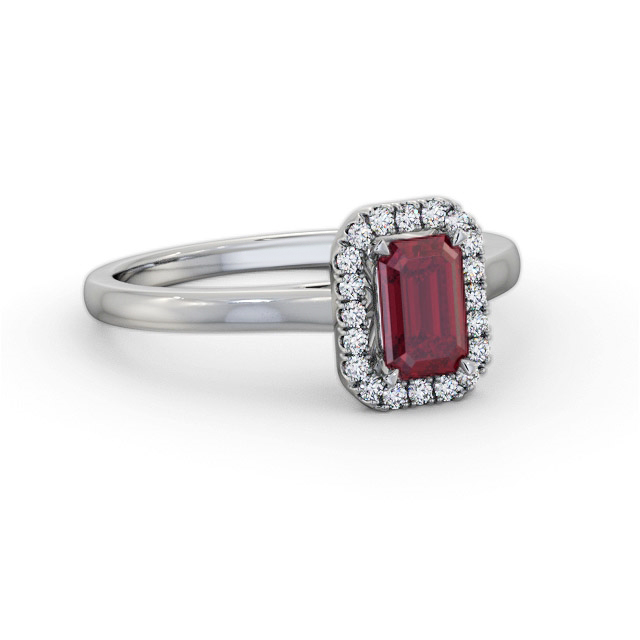 Gianni halo ruby and diamond 0.90ct ring in 18K White Gold. A single 0.75ct Emerald shaped ruby is surrounded by a cluster of small round shaped diamonds totaling 0.15ct in this traditional and impressive design ring. This ring is available in a variety of metal types and your choice of natural or lab grown gems. We provide a free design service for any special modifications that you may require.