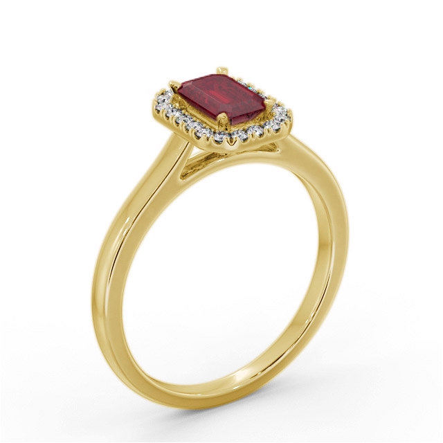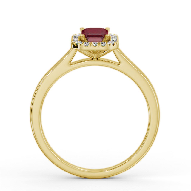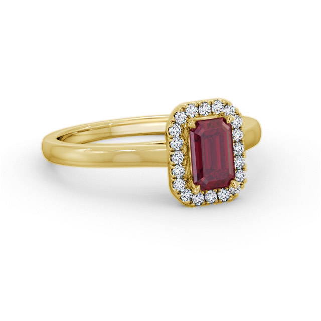 Gianni halo ruby and diamond 0.90ct ring in 18K Yellow Gold. A single 0.75ct Emerald shaped ruby is surrounded by a cluster of small round shaped diamonds totaling 0.15ct in this traditional and impressive design ring. This ring is available in a variety of metal types and your choice of natural or lab grown gems. We provide a free design service for any special modifications that you may require.