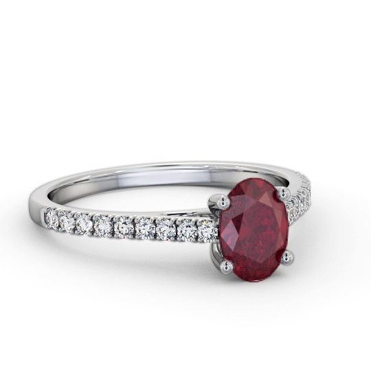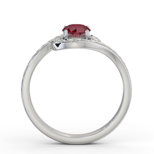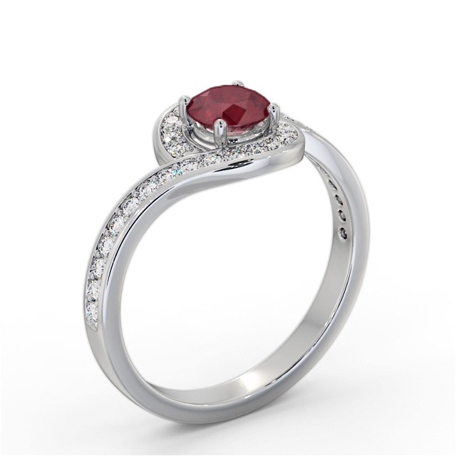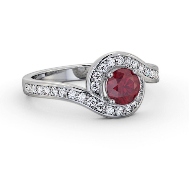 Denissa halo ruby and diamond 0.95ct ring in 18K White Gold. A striking and captivating design ring with a single 0.65ct round shaped ruby surrounded by a channel of small round shaped diamonds that extend down either side of the band and total 0.30ct in diamond weight. This ring is available in a variety of metal types and your choice of natural or lab grown gems. We provide a free design service for any special modifications that you may require.