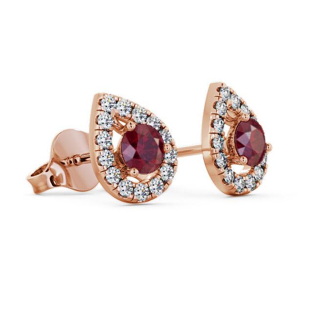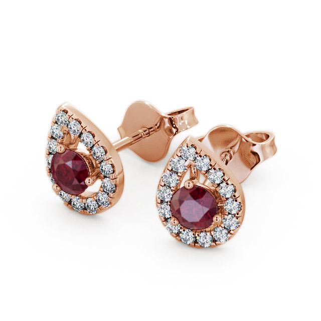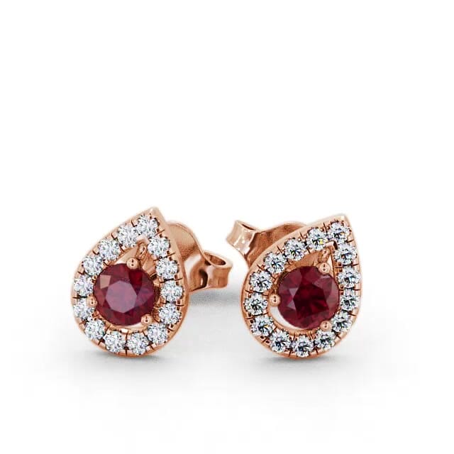 Brexley halo ruby and diamond 0.96ct earrings in a 18K Rose Gold setting. These spectacular stud earrings showcases ravishing 0.68 Carat total weight round ruby gemstones, framed by a pear-shaped halo of shimmering 0.28 Carat total weight of round diamonds. The total Carat weight is based on per pair. These earrings are available in a range of metal options with AAA grade gemstone. We offer a free design service for any customised changes that you may require.