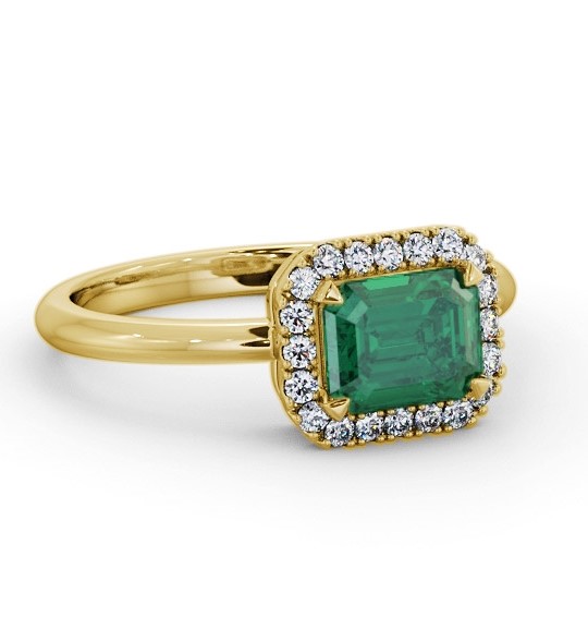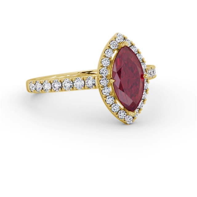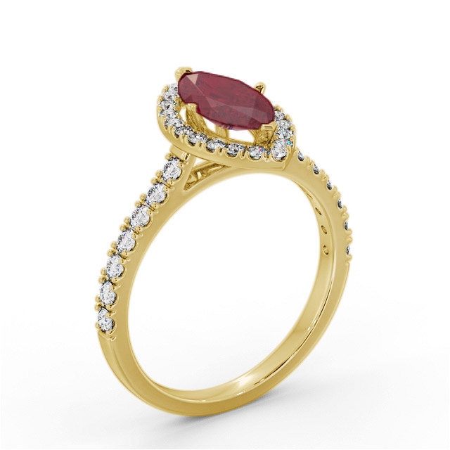 Elaris halo ruby and diamond 1.05ct ring in 18K Yellow Gold. A single 0.75ct Marquise shaped ruby is encircled by a cluster of small round shaped diamonds that extend down each side of the band and total 0.30ct in diamond weight. This ring is available in a variety of metal types and your choice of natural or lab grown gems. We provide a free design service for any special modifications that you may require.