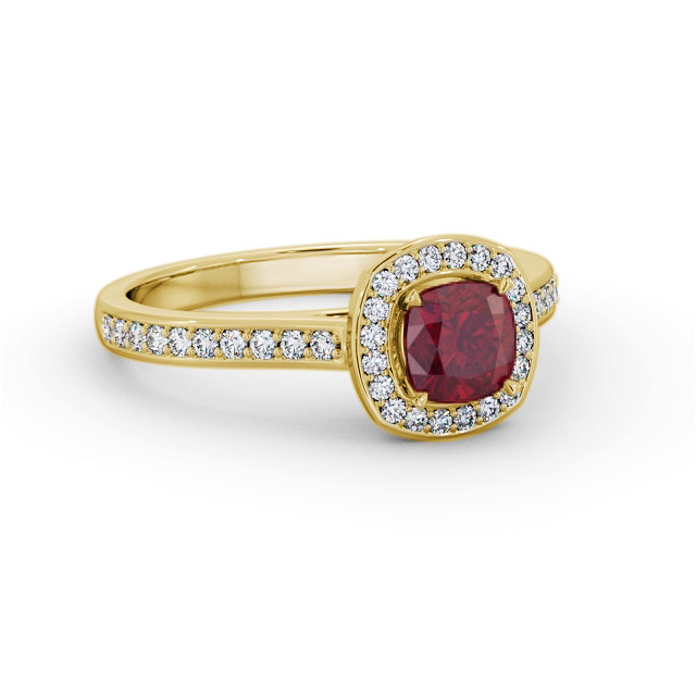Sanya halo ruby and diamond 1.05ct ring in 18K Yellow Gold. A single 0.75ct Cushion shaped ruby is encircled by a cluster of small round shaped diamonds that extend down each side of the band and total 0.30ct in diamond weight. This ring is available in a variety of metal types and your choice of natural or lab grown gems. We provide a free design service for any special modifications that you may require.