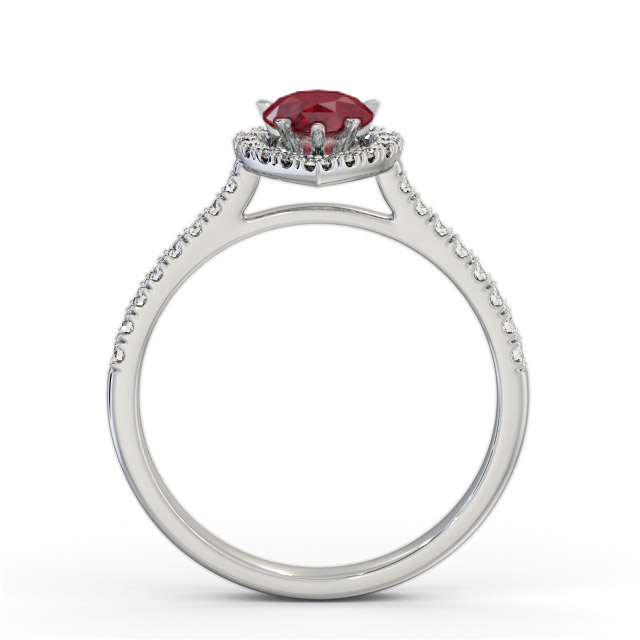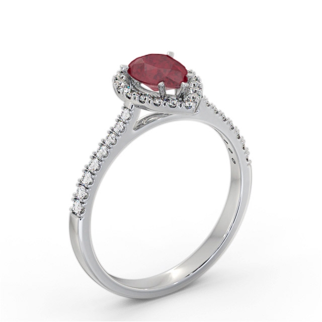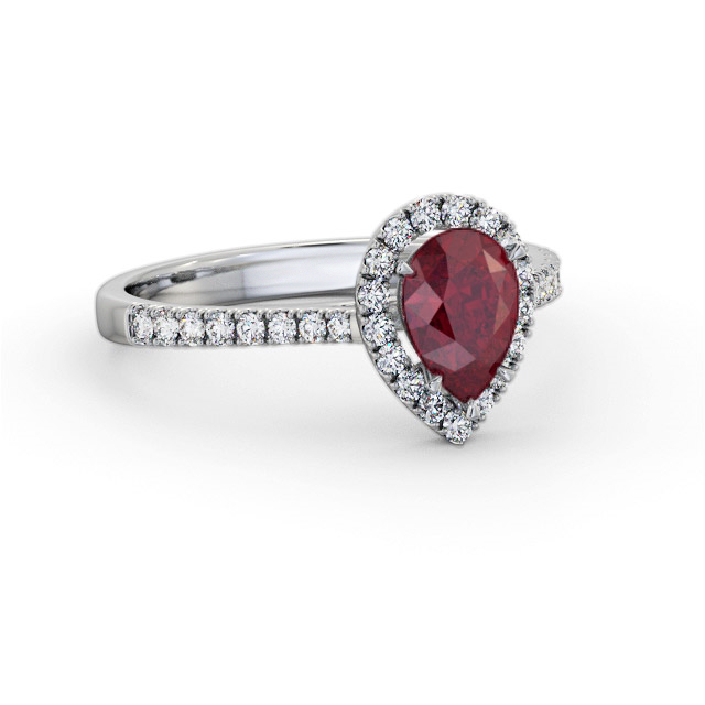 Danal halo ruby and diamond 1.20ct ring in 18K White Gold. Ring featuring a single 0.75ct Pear shaped ruby surrounded by a cluster of small round shaped diamonds that continue down either side of the band for a total diamond weight of 0.45ct. This ring is available in a variety of metal types and your choice of natural or lab grown gems. We provide a free design service for any special modifications that you may require.