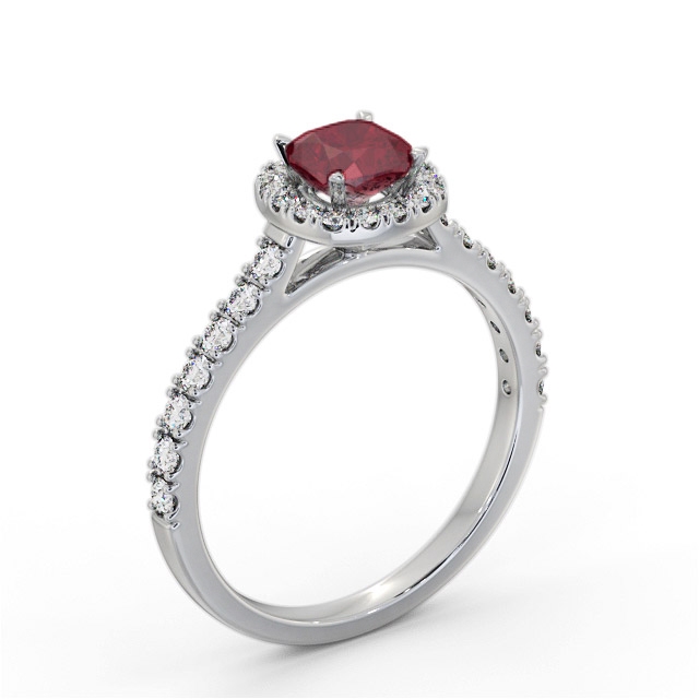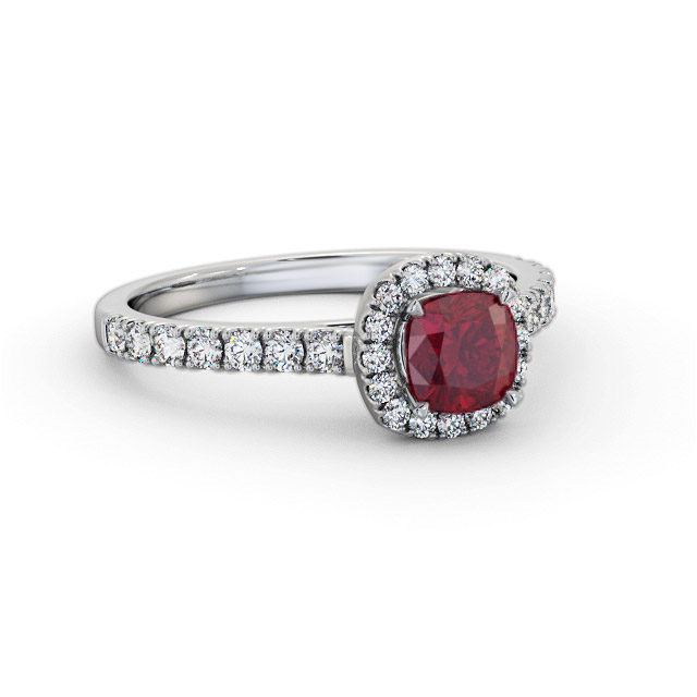 Laven halo ruby and diamond 1.20ct ring in 18K White Gold. A solitary 0.75ct Cushion shaped ruby is surrounded by a cluster of small round shaped diamonds that extend down either side of the band for a total diamond weight of 0.45ct in this traditional and beautiful style ring. This ring is available in a variety of metal types and your choice of natural or lab grown gems. We provide a free design service for any special modifications that you may require.