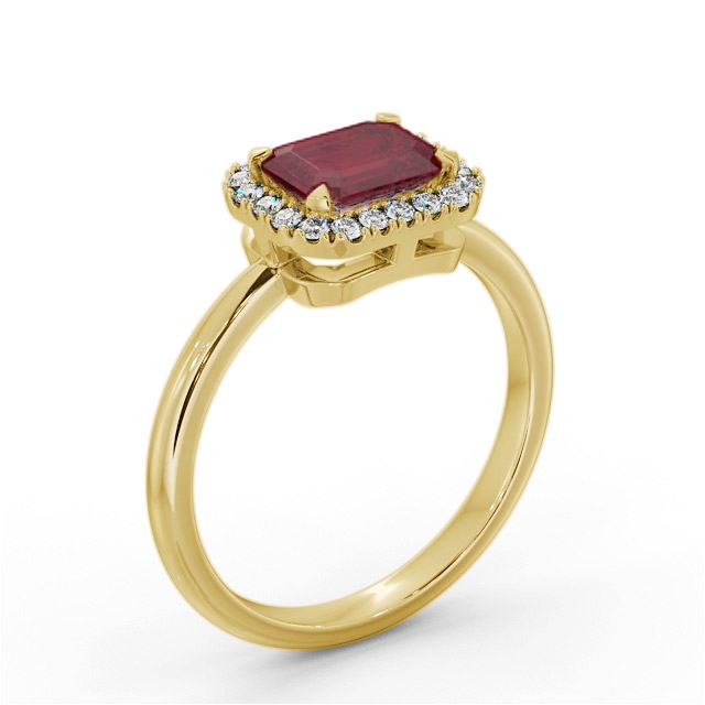Kodie halo ruby and diamond 1.30ct ring in 9K Yellow Gold. A single 1.15ct Emerald shaped ruby is encircled by a cluster of small round shaped diamonds totaling 0.15ct in this unique and beautiful design ring. This ring is available in a variety of metal types and your choice of natural or lab grown gems. We provide a free design service for any special modifications that you may require.