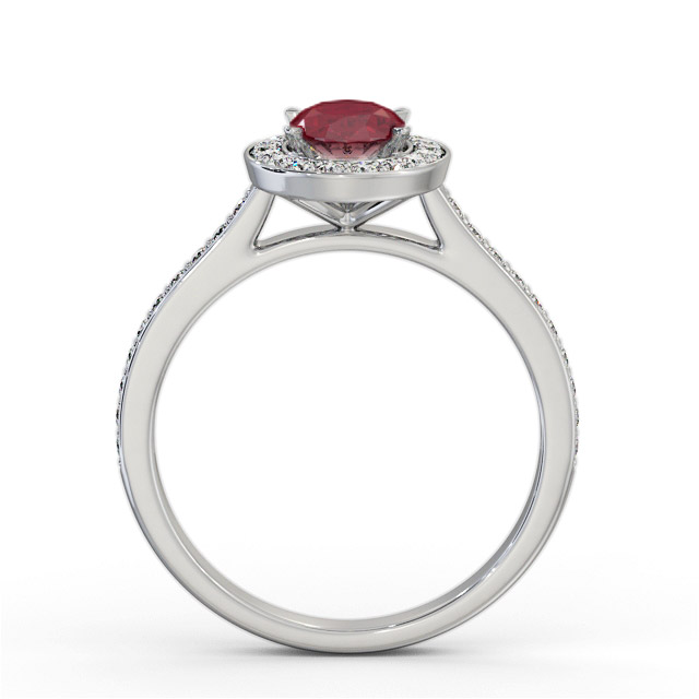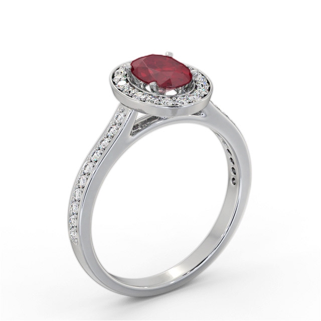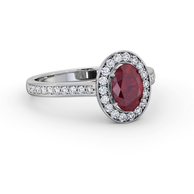 Camela halo ruby and diamond 1.35ct ring in 18K White Gold. Beautiful classic design ring with a single 1.05ct oval ruby surrounded by a cluster of small round shaped diamonds that extend down either side of the band and total 0.30ct in diamond weight. This ring is available in a variety of metal types and your choice of natural or lab grown gems. We provide a free design service for any special modifications that you may require.