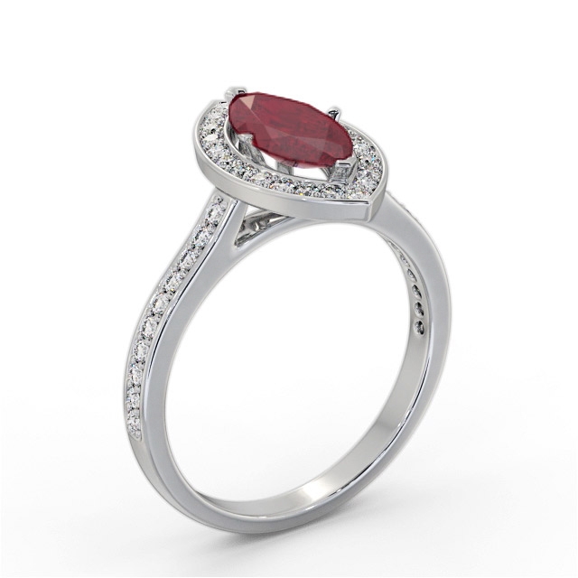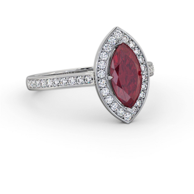 Amity halo ruby and diamond 1.50ct ring in 18K White Gold. A single 1.15ct Marquise shaped ruby is encircled by a cluster of small round shaped diamonds that extend down each side of the band and total 0.35ct in diamond weight. This ring is available in a variety of metal types and your choice of natural or lab grown gems. We provide a free design service for any special modifications that you may require.
