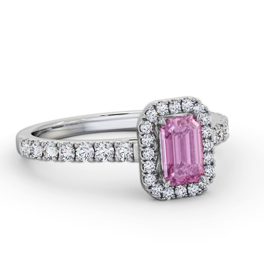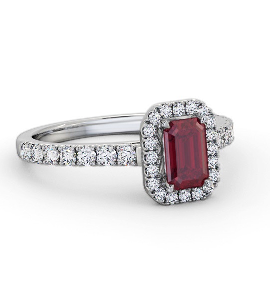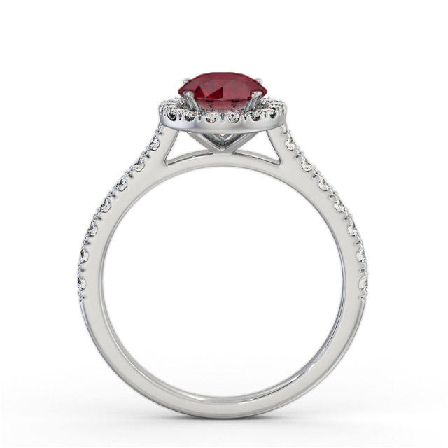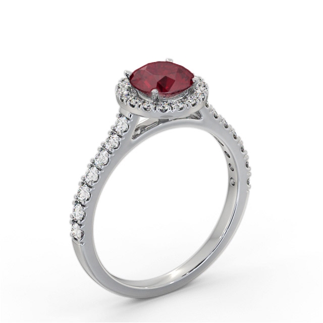 Frankie halo ruby and diamond 1.50ct ring in 18K White Gold. A single 1.05ct round shaped ruby is surrounded by a cluster of small round shaped diamonds that extend down either side of the band for a total diamond weight of 0.45ct in this traditional and exquisite style ring. This ring is available in a variety of metal types and your choice of natural or lab grown gems. We provide a free design service for any special modifications that you may require.