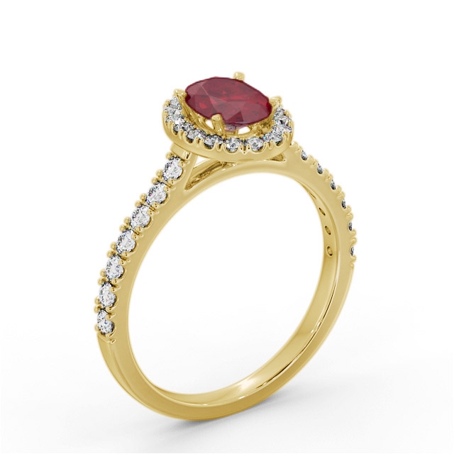 Kaniya halo ruby and diamond 1.50ct ring in 9K Yellow Gold. Ring with a single 1.05ct Oval shaped ruby surrounded by a cluster of small round shaped diamonds that continue down either side of the band for a total diamond weight of 0.45ct. This ring is available in a variety of metal types and your choice of natural or lab grown gems. We provide a free design service for any special modifications that you may require.