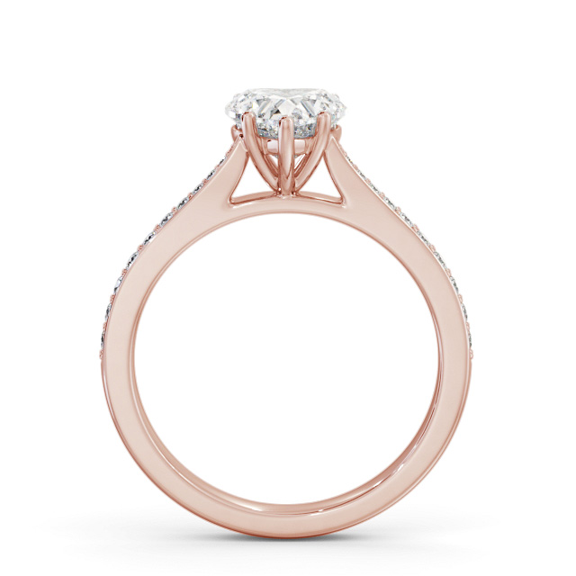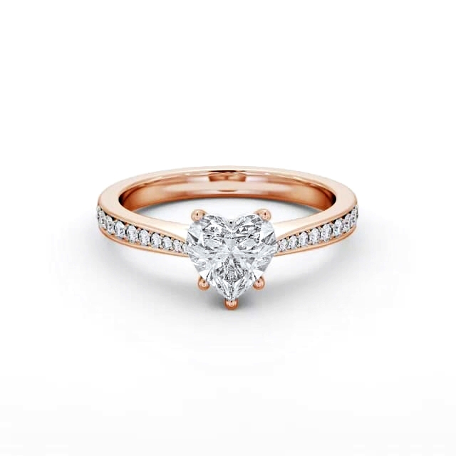 Onara diamond engagement ring with a five claw 9K Rose Gold setting. A breathtaking single heart shaped diamond in a five prong setting sparkles from the centre of this engagement ring, whilst small round diamonds adorn either side of the polished band. Total diamond side stones weigh approximately 0.18ct with Clarity VS1 and Colour F. This ring is available in a range of metal options and your choice of natural or lab grown diamonds. We offer a free design service for any customised changes that you may require.