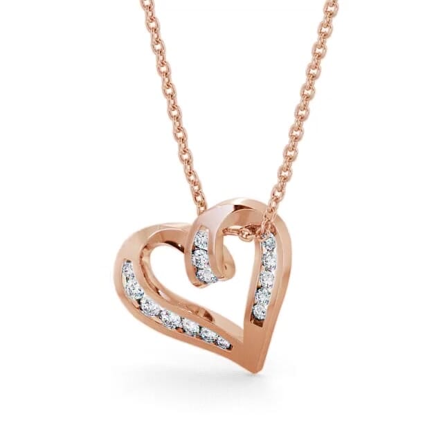 Soha heart shaped diamond 0.38 Carat pendant in 18K Rose Gold. Exuding fluid elegance and dazzling allure, this open heart pendant is adorned with a glittering channel set round diamonds. This pendant is available in a range of metal and chain options with your choice of natural or lab grown diamonds. We offer a free design service for any customised changes that you may require.