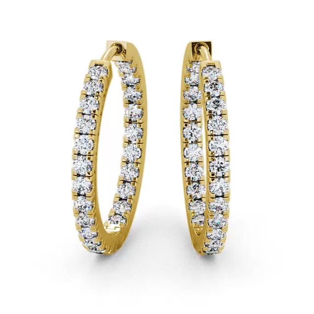Cosima hoop diamond earrings in 18K Yellow Gold. An absolute stunning design, these trendy hoop earrings boast sparkling round diamonds along the outside facing edge and inside back edge. The total diamond weight is based on per pair. These earrings are available in a range of metal options with your choice of natural or lab grown diamonds. Below table shows width and diameter of each earring based on carat selection. We offer a free design service for any customised changes that you may require.
