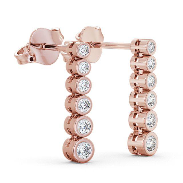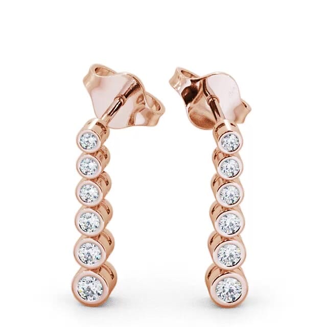 Kandice diamond journey earrings in 18K Rose Gold. A glamourous choice, these journey style drop earrings showcase a sparkling row of bezel set graduated round diamonds. The total diamond weight is based on per pair. These earrings are available in a range of metal options and your choice of natural or lab grown diamonds. We offer a free design service for any customised changes that you may require.