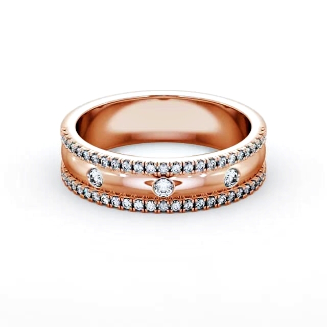 Malin ladies diamond wedding ring in 18K Rose Gold. This beautiful wedding ring features three spaced out round diamonds in the centre, and row of small round diamonds running half way on both the edges. Total diamonds weighs 0.26 Carat. This ring is available in a range of widths and metal options with your choice of natural or lab grown diamonds. We offer a free design service for any customised changes that you may require.