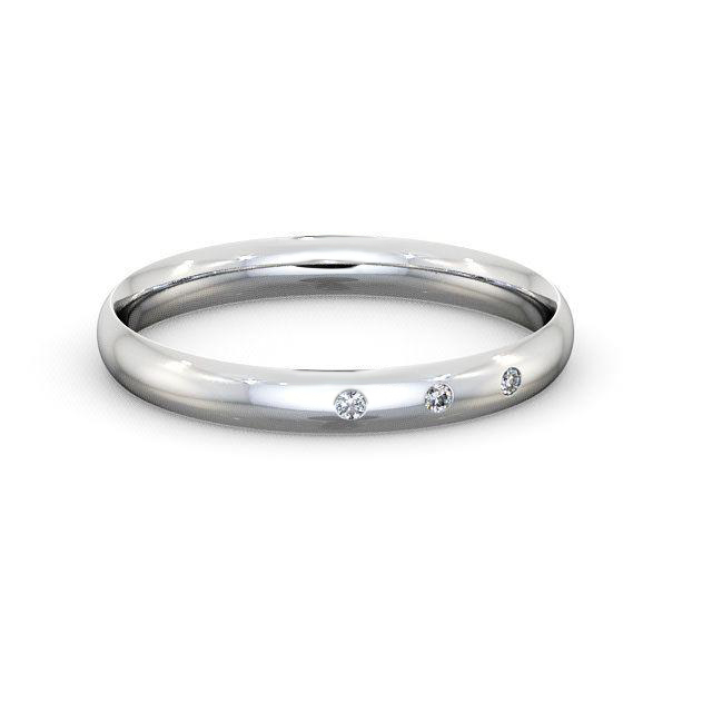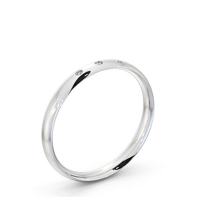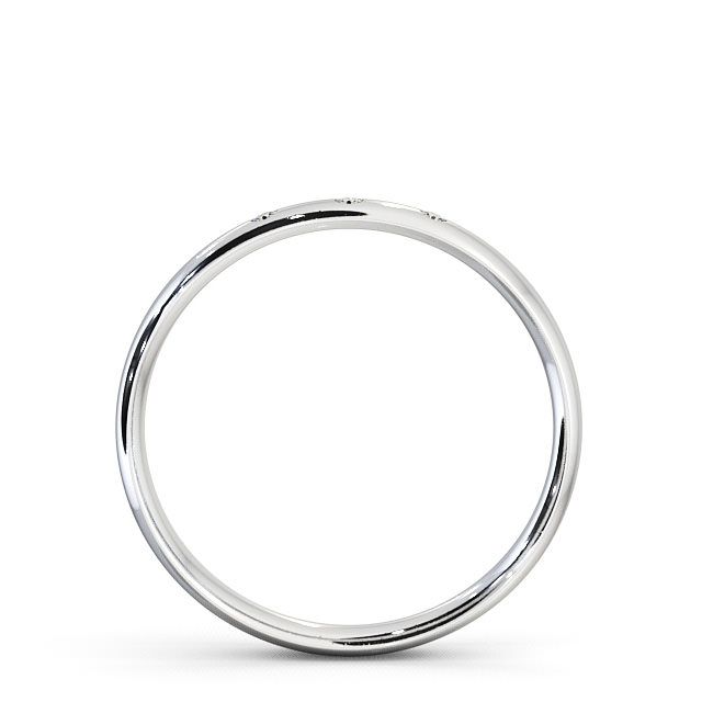 Court Three Stone ladies diamond wedding ring in 18K White Gold. This dainty court shaped wedding ring showcases three sparkling diamonds set into a pretty highly polished smooth band. This ring is available in a range of widths, depths, and metal options. We offer a free design service for any customised changes that you may require.