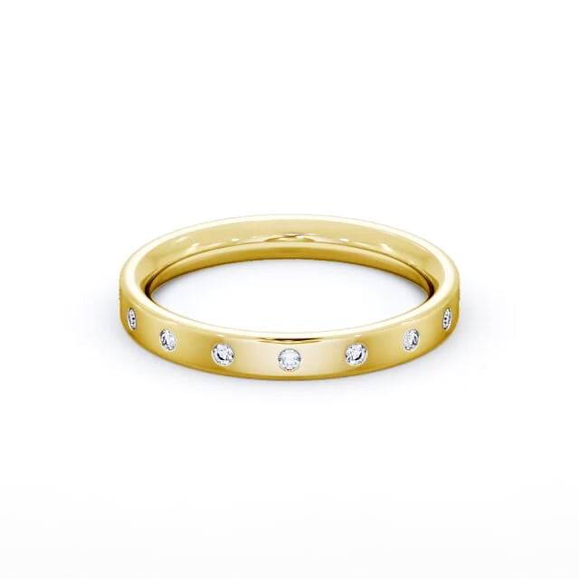 Callaway ladies diamond wedding ring in 9K Yellow Gold. A row of dazzling diamonds lends an eye-catching sparkle along the flat comfort style band for timeless allure. This ring is available in a range of widths, depths, and metal options. We offer a free design service for any customised changes that you may require.