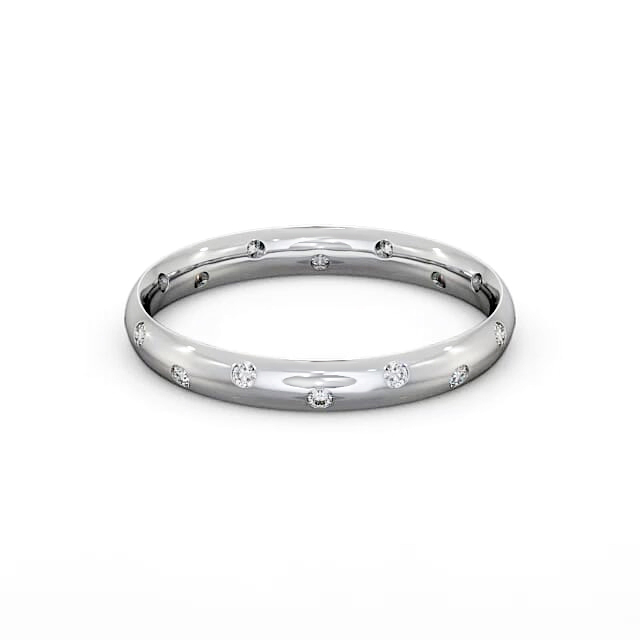 Sariya ladies diamond wedding ring in 9K White Gold. Fashioned in a stunning style, this court shaped wedding ring features round diamonds around the circle in a chic scatter pattern. This ring is available in a range of widths, depths, and metal options. We offer a free design service for any customised changes that you may require.