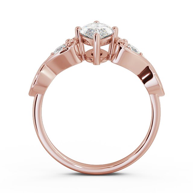 Celestine diamond engagement ring with a four claw 18K Rose Gold setting. With simple beauty, this engagement ring showcases a marquise shaped diamond in the centre flanked by two smaller round diamonds adorned by heart design shoulders. The diamond side stones are an approximate total of 0.10ct with Clarity VS1 and Colour F. This ring is available in a range of metal options and your choice of natural or lab grown diamonds. We offer a free design service for any customised changes that you may require.