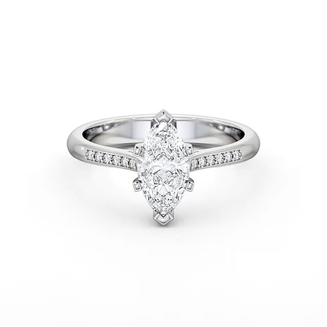 Lainey diamond engagement ring with a four claw 18K White Gold setting. Exquisite and modern, this engagement ring displays a marquise shaped diamond centre stone in a special six prong setting. Additional round diamonds and a polished finish lights up this slightly tapered ring. Total diamond side stones weigh approximately 0.07ct with Clarity VS1 and Colour F. This ring is available in a range of metal options and your choice of natural or lab grown diamonds. We offer a free design service for any customised changes that you may require.
