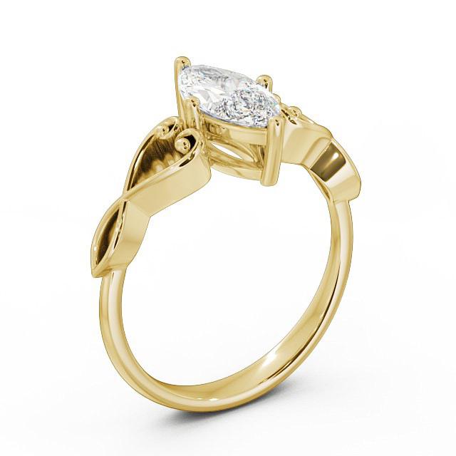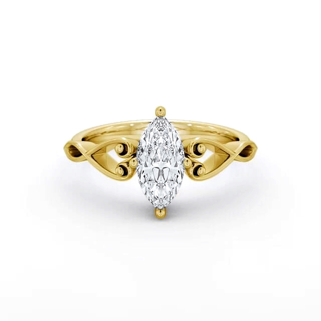 Anisha diamond engagement ring with a four claw 18K Yellow Gold setting. This dazzling engagement ring features a marquise-shaped diamond prong set atop a heart design shoulders with a mid band width of 1.2mm. This ring is available in a range of metal options and your choice of natural or lab grown diamonds. We offer a free design service for any customised changes that you may require.