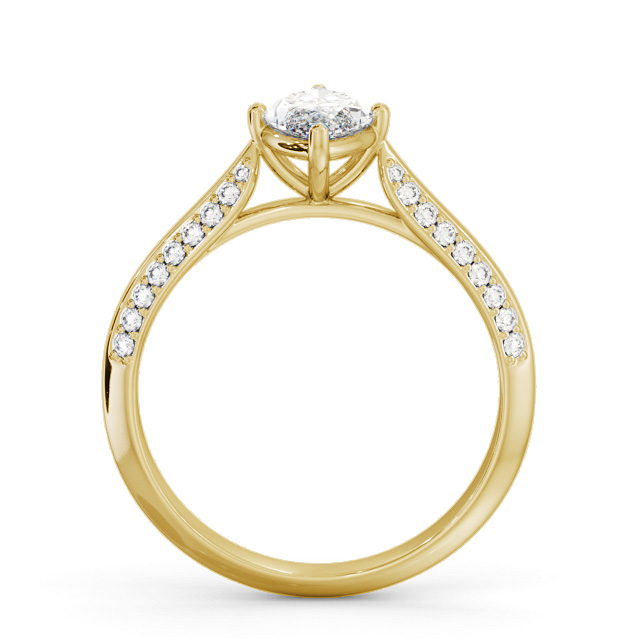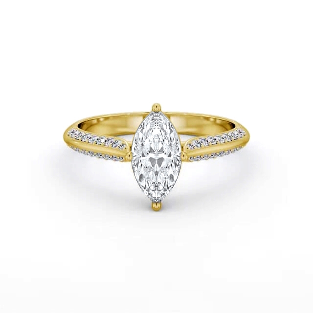 Layah diamond engagement ring with a four claw 18K Yellow Gold setting. Remarkably delightful, a charming marquise shaped centre diamond is uplifted by a row of small round diamonds half way around the knife edge design band. Total diamond side stones weigh approximately 0.28ct with Clarity VS1 and Colour F. This ring is available in a range of metal options and your choice of natural or lab grown diamonds. We offer a free design service for any customised changes that you may require.