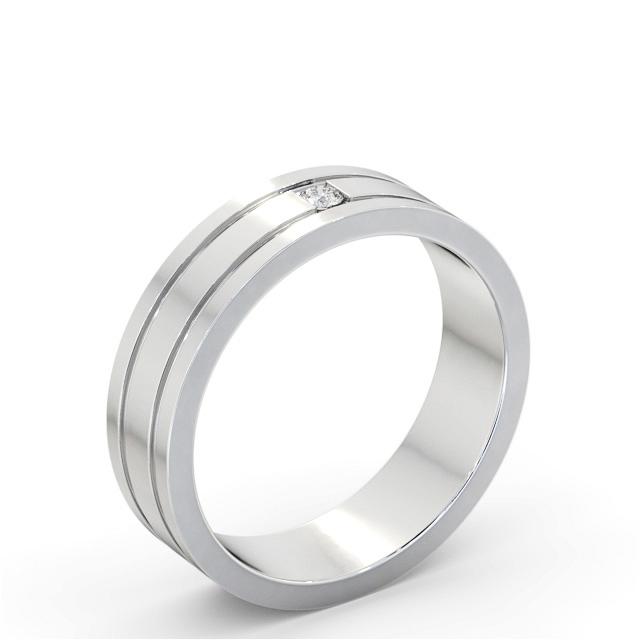 Yasal men's diamond wedding ring in 9K White Gold. This stylish men's wedding ring is graced with a single round shaped diamond and a striking double grooved patterns throughout the band. This ring is available in a range of widths, depths, and metal options. We offer a free design service for any customised changes that you may require.