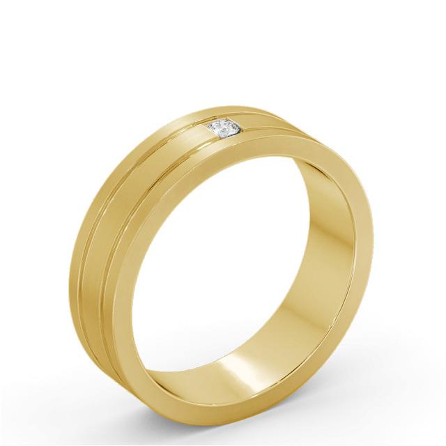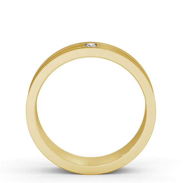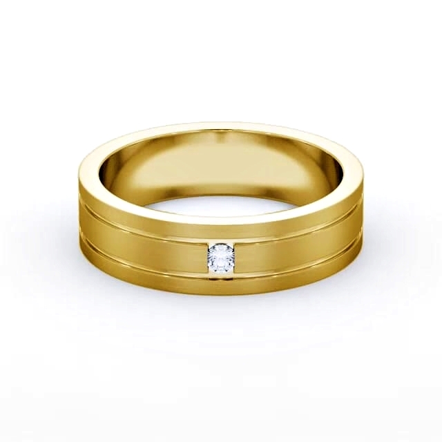 Darragh (Matt) mens diamond wedding ring in 9K Yellow Gold with a brushed style surface finish. Flat style ring with a single round shaped diamond set in the centre of the band. The ring is available in a choice of widths, depths, and metal options. We also offer a free design service for any customised changes that you may require.