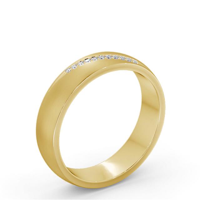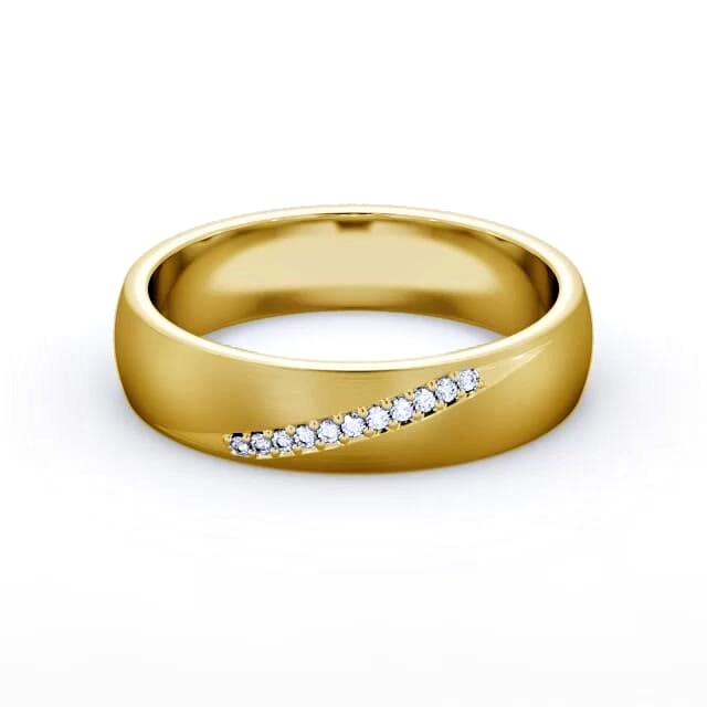 Brenley men's diamond 0.05 Carat wedding ring in 18K Yellow Gold. Masculine and impressively confident, this men's wedding ring features a diagonal row of small diamonds on a brushed finished band. This ring is available in a range of metal options and your choice of natural or lab grown diamonds. We offer a free design service for any customised changes that you may require.