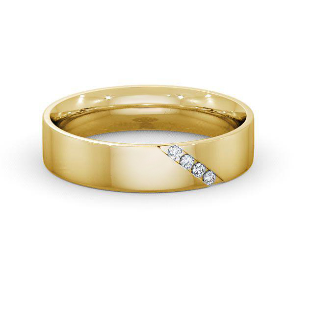 Maple men's diamond 0.06 Carat wedding ring in 9K Yellow Gold. Classic styling with a dash of trendy allure, this wedding ring showcases a diagonal row of four round diamonds set on flat outside surface with court shaped inside for maximum comfort. This ring is available in a range of widths, depths, and metal options. We offer a free design service for any customised changes that you may require.