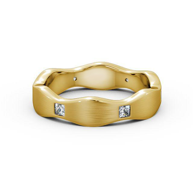Dayra (Matt) men's diamond wedding ring in 18K Yellow Gold. Delightfully original in style, this wedding ring depicts a striking pattern with six evenly spaced out sparkling princess shaped diamonds and matt finish outer surface. Listed width relates to the widest part of the ring. This ring is available in a range of metal options with only natural diamonds. We offer a free design service for any customised changes that you may require.