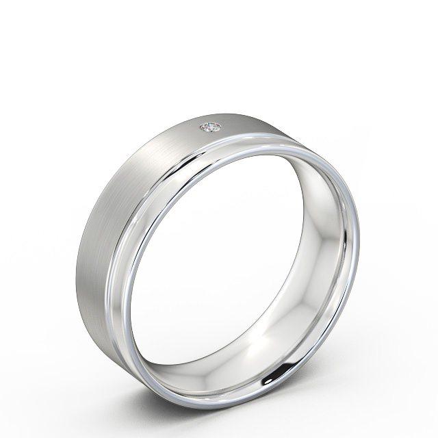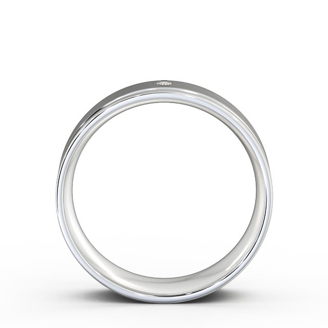 Amina (Matt) men's diamond wedding ring in 18K White Gold. Classic yet modern, this flat wedding ring features a single centre round diamond set on a rich matt surface, with contrasting polished grooved detailing on one edge. This ring is available in a range of widths, depths, and metal options. We offer a free design service for any customised changes that you may require.