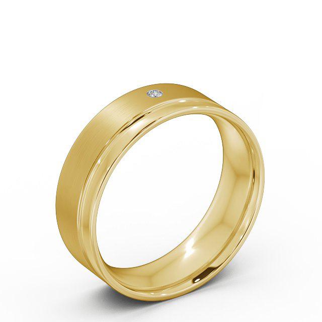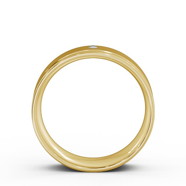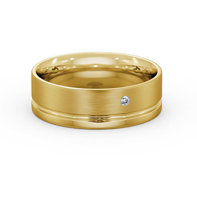 Amina (Matt) men's diamond wedding ring in 18K Yellow Gold. Classic yet modern, this flat wedding ring features a single centre round diamond set on a rich matt surface, with contrasting polished grooved detailing on one edge. This ring is available in a range of widths, depths, and metal options. We offer a free design service for any customised changes that you may require.