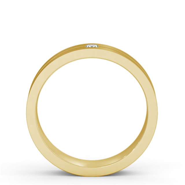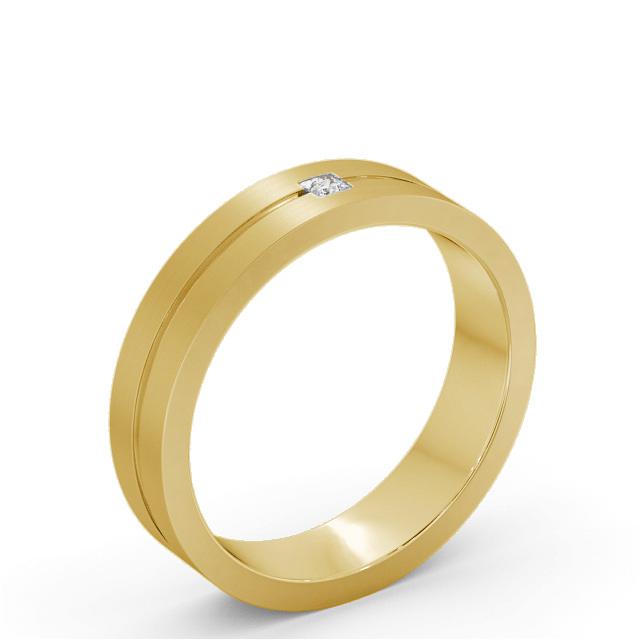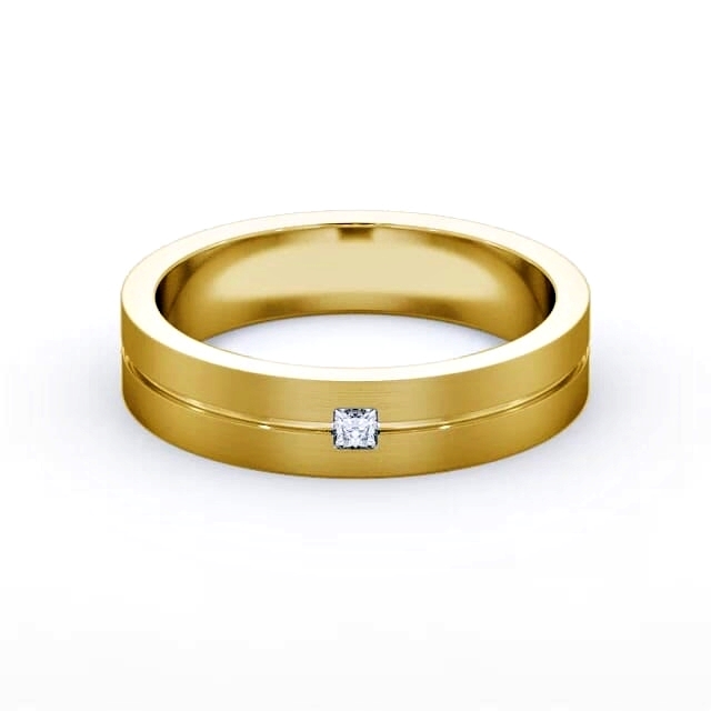 Benson men's diamond wedding ring in 18K Yellow Gold. This stylish men's wedding ring is embellished with a continuous grooved line and a single princess shaped diamond set on a brushed finished band. This ring is available in a range of widths, depths, and metal options. We offer a free design service for any customised changes that you may require.