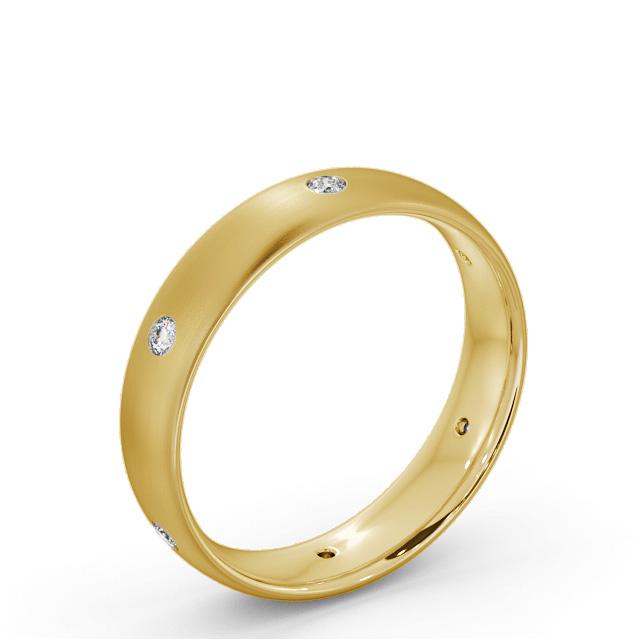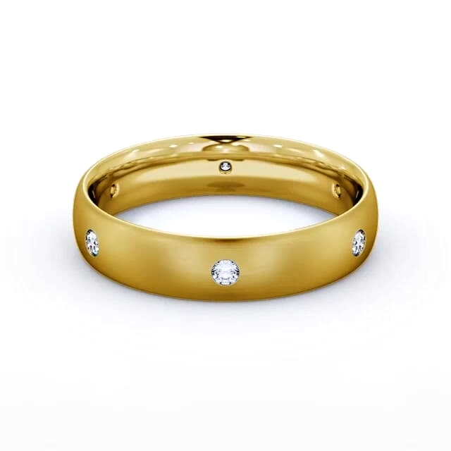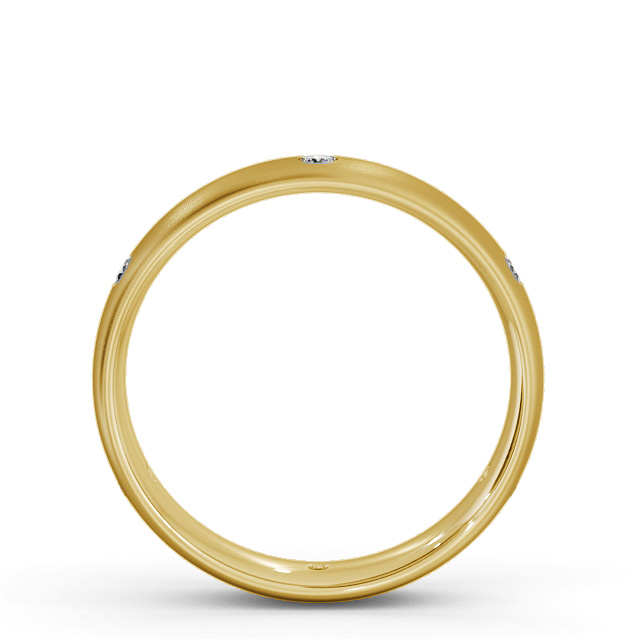 Hecter men's diamond wedding ring in 18K Yellow Gold. Weaving together style and comfort, this men's wedding ring features six sparkling round diamonds evenly spaced on a brushed finished court style band. This ring is available in a range of widths, depths, and metal options. We offer a free design service for any customised changes that you may require.
