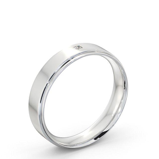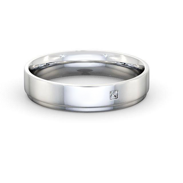 Orion men's diamond wedding ring in 9K White Gold. A classic flat court wedding ring with a single princess shaped diamond set on a polished surface along with a charming step down edge on one side. This ring is available in a range of widths, depths, and metal options. We offer a free design service for any customised changes that you may require.