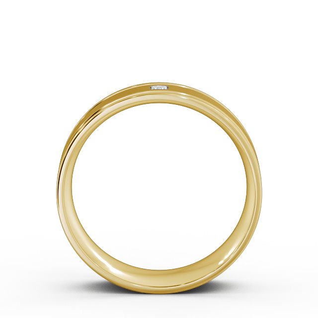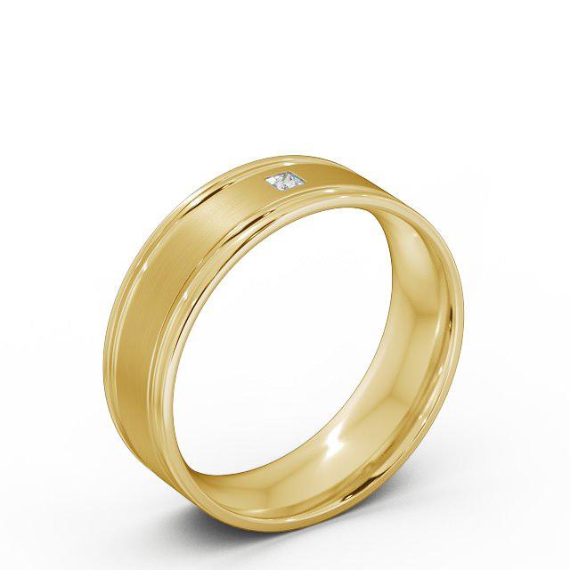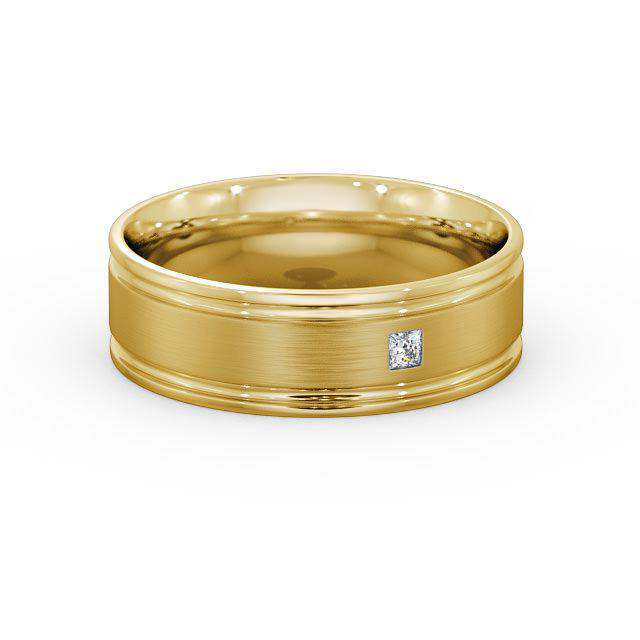 Eldon (Matt) men's diamond wedding ring in 9K Yellow Gold. Designed to perfection, this flat court wedding ring features a single princess shaped diamond set on a rich matt finish centre, flanked by two polished grooves and rounded edges. This ring is available in a range of widths, depths, and metal options with only natural diamonds. We offer a free design service for any customised changes that you may require.