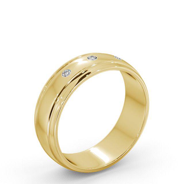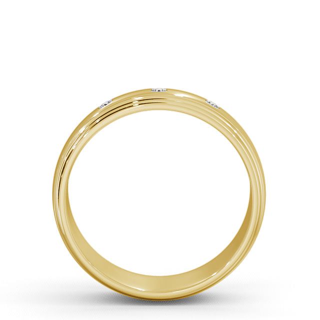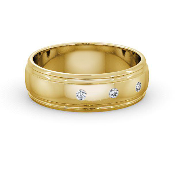 Mayford men's diamond wedding ring in 9K Yellow Gold. An elegant and simple D-shape wedding ring features three sparkling round diamonds flanked by superb grooved design edges. This ring is available in a range of widths, depths, and metal options. We offer a free design service for any customised changes that you may require.