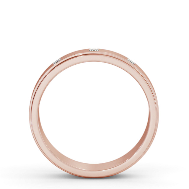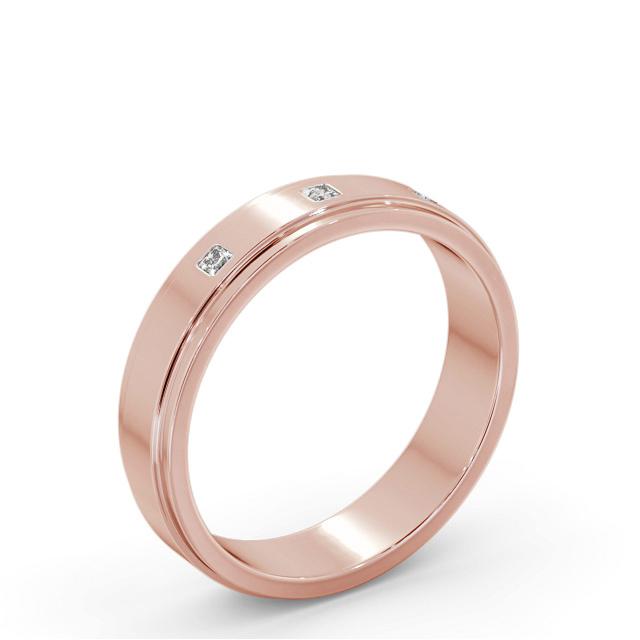 Basten men's diamond wedding ring in 18K Rose Gold. This men's step style wedding ring highlights three princess shaped diamonds and a bright polished finish. This ring is available in a range of widths, depths, and metal options. We offer a free design service for any customised changes that you may require.