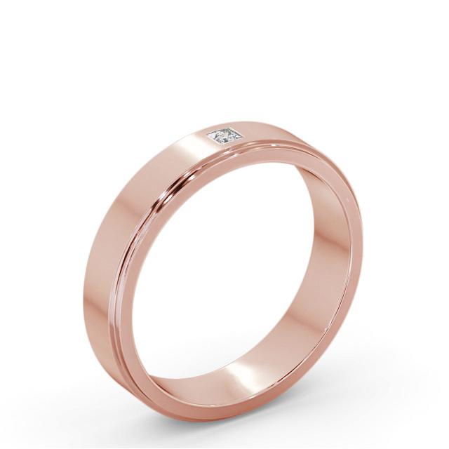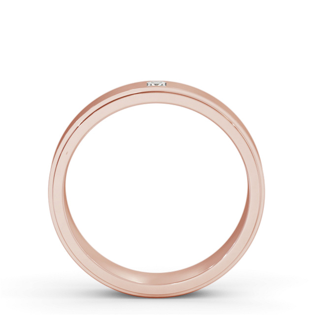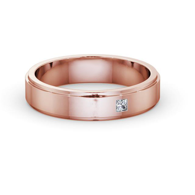 Hacket men's diamond wedding ring in 18K Rose Gold. Handsome and refined, this men's wedding ring exhibits a single princess shaped diamond along the centre and a clean stepped edge. This ring is available in a range of widths, depths, and metal options. We offer a free design service for any customised changes that you may require.