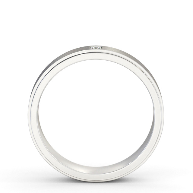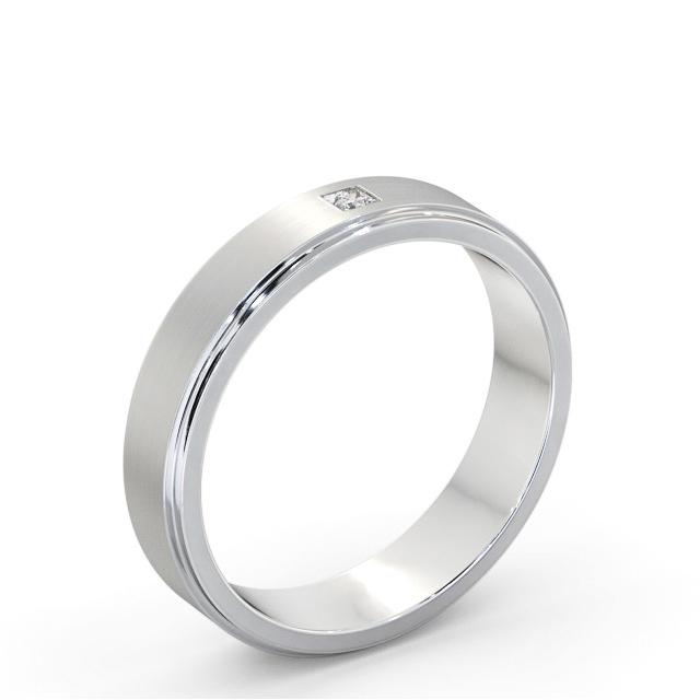 Dunne (Matt) mens diamond wedding ring in 18K White Gold with a brushed style surface finish. Contemporary design with a single princess shaped diamond on a step style band. The ring is available in a choice of widths, depths, and metal options. We also offer a free design service for any customised changes that you may require.