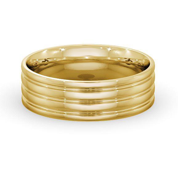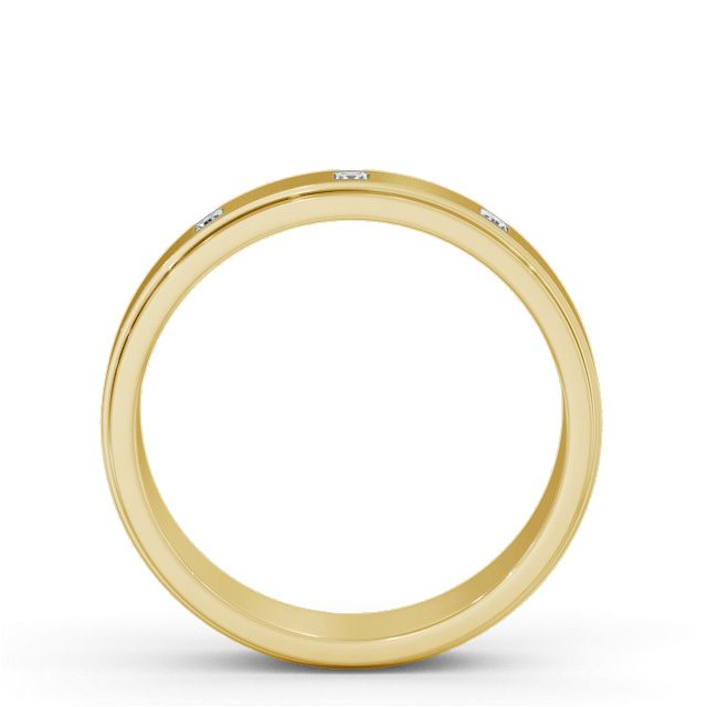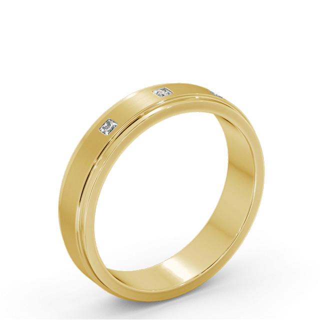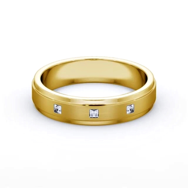 Basten men's diamond wedding ring in 18K Yellow Gold. This men's step style wedding ring highlights three princess shaped diamonds and a brushed surface finish. This ring is available in a range of widths, depths, and metal options. We offer a free design service for any customised changes that you may require.