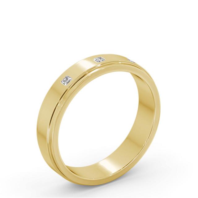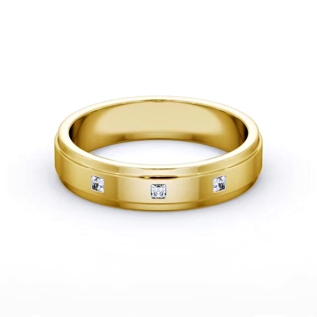Basten men's diamond wedding ring in 18K Yellow Gold. This men's step style wedding ring highlights three princess shaped diamonds and a bright polished finish. This ring is available in a range of widths, depths, and metal options. We offer a free design service for any customised changes that you may require.