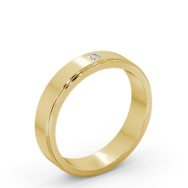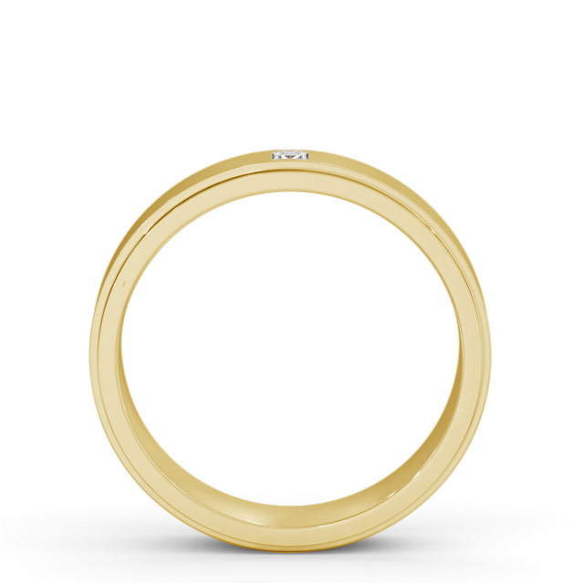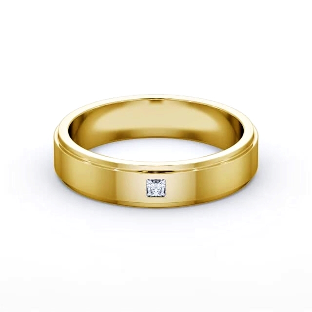 Hacket men's diamond wedding ring in 9K Yellow Gold. Handsome and refined, this men's wedding ring exhibits a single princess shaped diamond along the centre and a clean stepped edge. This ring is available in a range of widths, depths, and metal options. We offer a free design service for any customised changes that you may require.