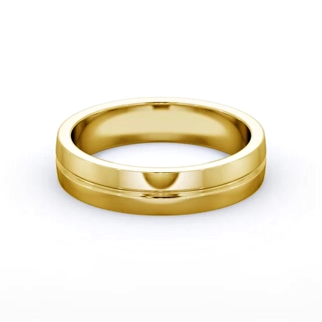 Jaden men's wedding ring in 18K Yellow Gold. Bold and masculine, this stunning ring features a single groove in the centre that encircles the entire polished finish sleek band. The ring is available in a range of widths, depths, and metal options. We offer a free design service for any customised changes that you may require.