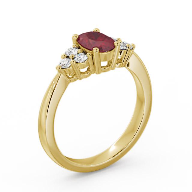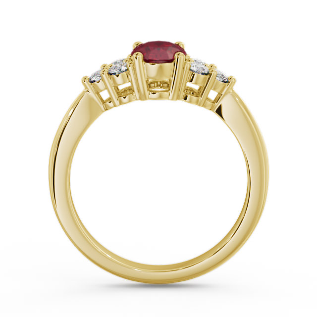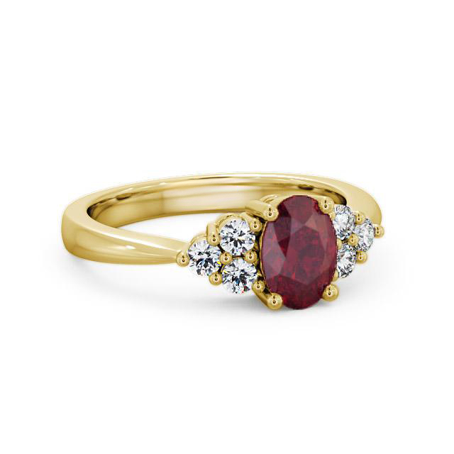 Cassidy multi stone ruby and diamond 1.24ct ring in a 9K Yellow Gold setting. This alluring ruby and diamond ring features an impressive 1.00 Carat oval shaped ruby centre gemstone flanked by three round shaped diamonds on either side with a total weight of 0.24 Carat. This ring is available in a range of metal options with AAA grade gemstone. We offer a free design service for any customised changes that you may require.